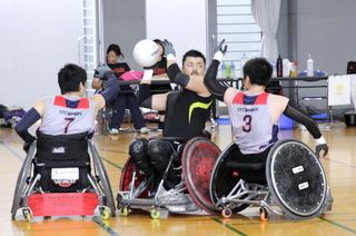 実戦を想定して、ボールを持っていると選手が車いすでタックルしてきます。