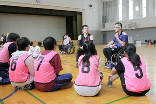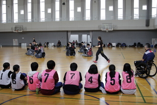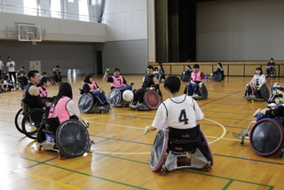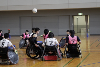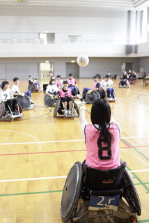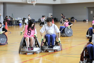 見学のあとは、競技用車いすに慣れるための練習と、車いすでのパス回しの練習です。