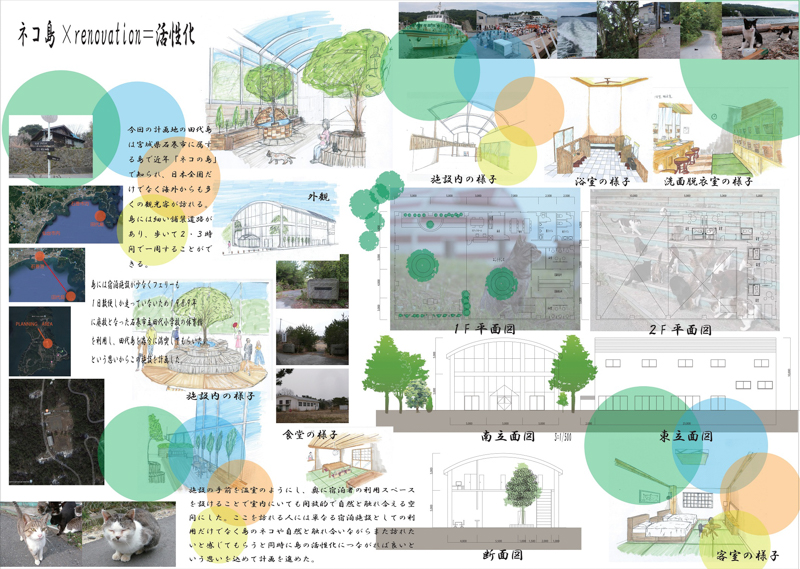 作品コンセプト:ネコの島で有名な田代島の活性化。廃校となった小学校を使い、宿泊施設へリノベーション。新しいリゾートの島へと変化させるプラン。
