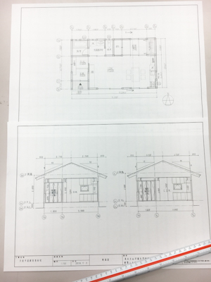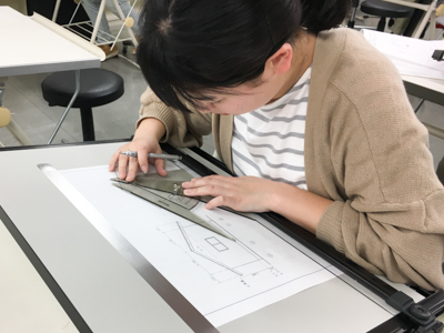 住宅の平面図からスタートしてすでに3種類目の図面を描いています。初めて建築を学ぶ学生にとっては、手描きで製図をするという事は非常に重要な学習です。