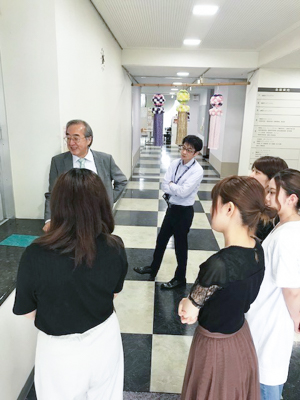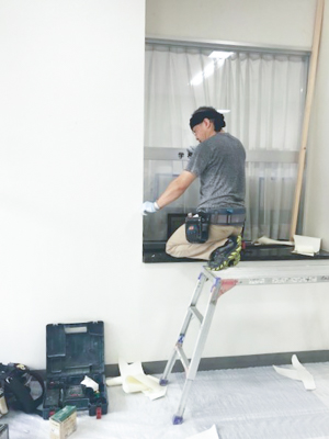 インテリア科の学生も、壁紙を貼る「施工演習」という科目があり、壁紙を貼ることはできますが、今回は下地の大工工事もあり、夏休み期間中に工事が行われました。工事をしてくださったのは、「施工演習」担当の非常勤講師で内装業のプロ、及川先生です。