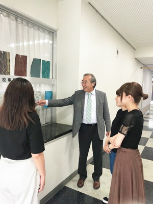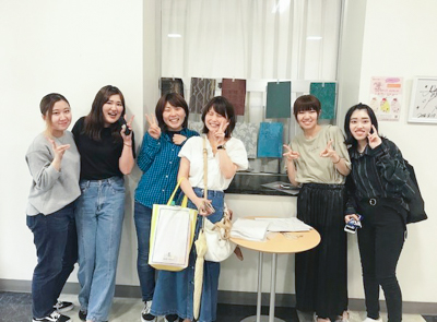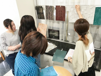 まず、壁紙メーカーのリリカラ、サンゲツ、シンコール、トキワの4社5冊の見本帳を1冊ずつ担当し、その中からこの空間に相応しいと思うものを2~3点厳選しました。それを、リフォームの場所に持っていき貼りつけます。卒業生で非常勤講師、インテリアコーディネーターの遠藤先生も一緒にパチリ!最終選考の準備は整いました。