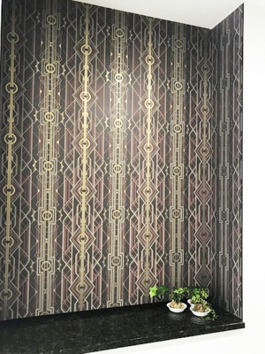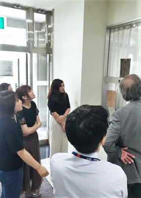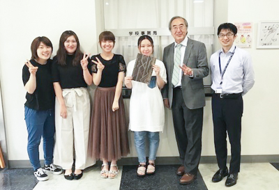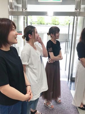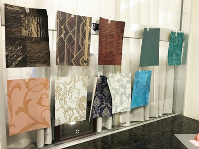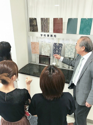 専門学校玄関ホールの一部をリフォームすることになり、「それならインテリア科にまかせて!」と、女子学生の有志、石岡和紗さん、石村汐莉さん、栗田祐利果さん、今野直江さん、渡辺萌雅さんの5名が壁紙の選定に挑戦してくれました。