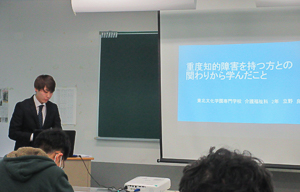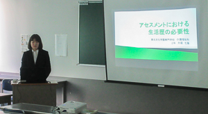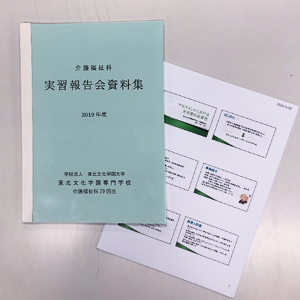 実習Ⅳ(令和元年10月30日~11月28日)で担当した、ご利用者様の介護計画について、ご指導いただいた先生方及び後輩(介護福祉科1年生)を前に、その実施結果を発表しました。