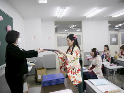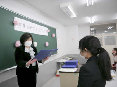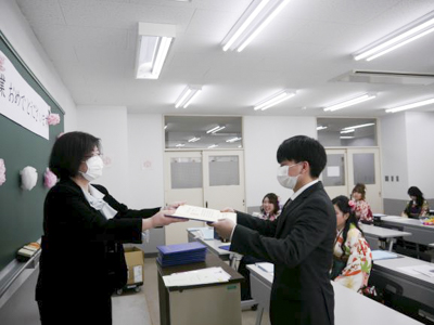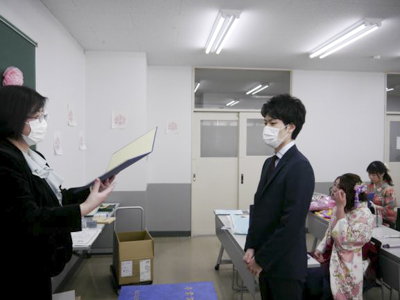 2020年3月18日(水)、規模を縮小し、科ごとに教室において卒業証書授与式を行いました。いつもの2108教室です。