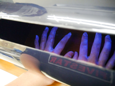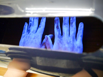 ③ブラックライトを当ててみると洗い残しの部分が光って見えます。汚れが落ちていないのがわかります。