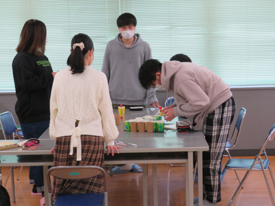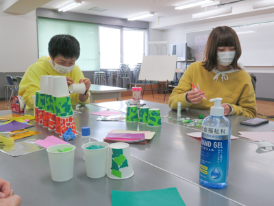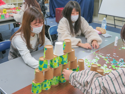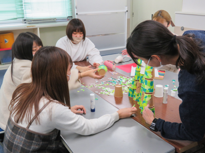 この授業はレクリエーション・インストラクターを養成する授業の一環ですが、今回はクリスマス間近であることやコロナ禍の影響でゴージャスなパーティーの開催が難しいことから、身近にある紙コップや紙皿などを利用しての今回の企画実施となりました。