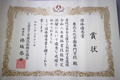 令和2年度 秘書技能検定 団体優秀賞を受賞することができました。