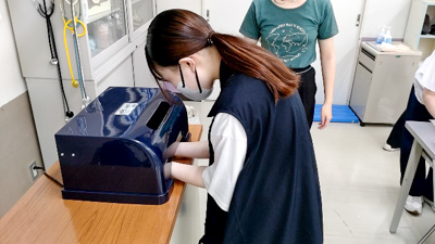 手洗いの後に汚れが見える器機で洗えたか確認中。
