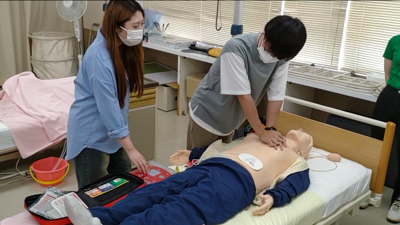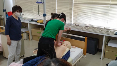 看護・保健概論の時間を使って心肺蘇生と手洗いについて勉強しました。