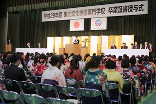 国見の丘にもようやく春の息吹が感じられる弥生三月の佳き日に、平成29年度東北文化学園専門学校卒業証書授与式を盛大に挙行できますことは、卒業生、在校生はもちろんのこと、私達教職員にとりましてもこのうえない慶びであります。