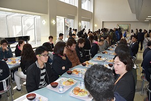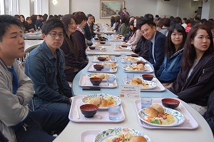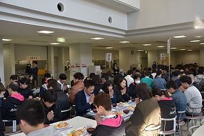 先輩学生や学科の先生方と一緒に朝食をとります。