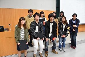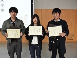 前年度の成績が優秀だった学生、および、基礎演習Ⅱの評価が高評価だった学生に対して、賞状と商品が手渡されます。