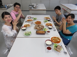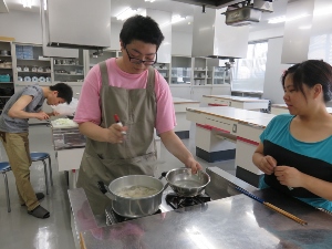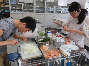 調理では恐る恐る包丁を握る男子学生に対して、女子学生は切ってみせて、やらせてみせ、ほめてみてと上手に進めていきます。