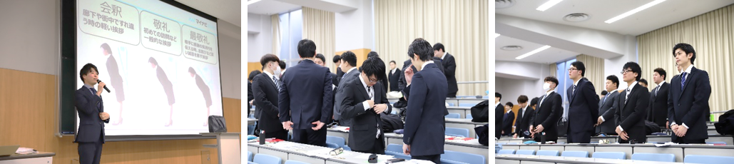 「就活キックオフ!」に続いて行われたガイダンスでは、面接官や人事担当者に好印象を持ってもらうための身だしなみや挨拶のマナーについて説明を受けました。面接当日に慌てないためにも、ガイダンスで学んだことを確認し、余裕を持って本番を迎えましょう。