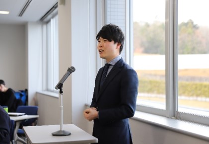 今年度は、「キャリア戦略Ⅱ」を担当している株式会社マイナビの後藤智大先生にもご参加いただきました。初めての就活に不安を抱く3年生に向けて、「視野を広く持つこと」「自分に嘘をつかないこと」「自分に自信を持つこと」を挙げ、熱のこもった力強いエールを送ってくれました。