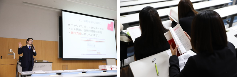 キャリアサポートセンター担当者による説明 ガイドブックに見入る学生