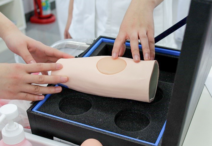 基礎看護の授業では、血管等のモデルを使って注射の練習をします。