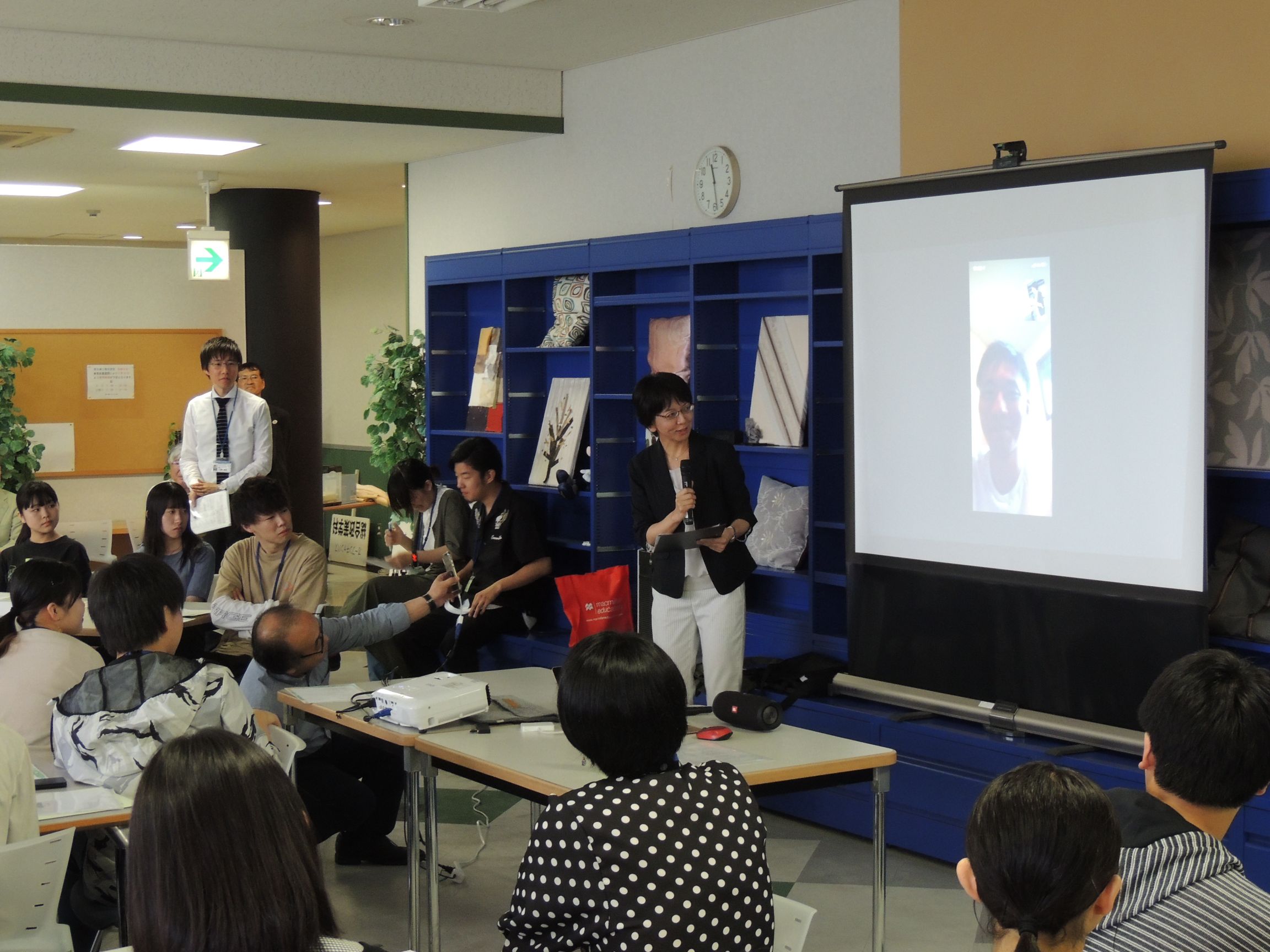 ポートランドで留学中の在学生から中継で留学の近況報告をしてくれた。