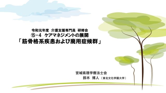 宮城県と特定非営利活動法人宮城県ケアマネジャー協会が協定を結んで実施している「令和元年度介護支援専門員研修会」において、本専攻の鈴木博人 助教が講師を担当しました。
