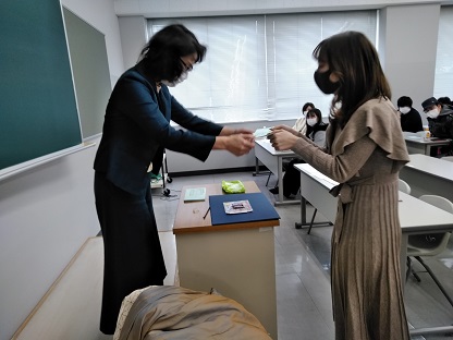 そして、記念品贈呈。各担当教員から心づくしのプレゼントです。中身は、免許証ホルダー(合格して免許をとるぞ!という気になります。本学キャリアサポートセンターからのご支援でした)、教員の一言を書き入れた「カイロ」(チョコレート付き)でした。