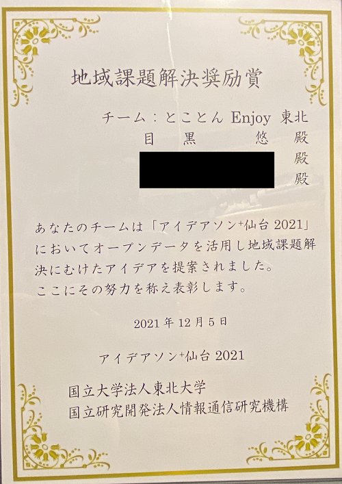 本学科3年次生 目黒悠さんをキャプテンとしたチームが、東北の魅力発信、地域課題解決にオープンデータを利活用した新しいアプリやサービスを検討・提案したり必要なオープンデータの提案を行う “2021年度「アイデアソン+ 仙台」” で受賞しました。