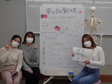 交流活動のメインイベントの一つはお互いの学校紹介でした.本専攻の学生はADL室紹介を企画しました.カメラを通してADL室の設備や備品を紹介したり,授業時の風景を説明したりしました.日本語での紹介でしたが,わかりやすいように前もって中国語が書いたスケッチブックを用意しました.台湾の学生たちは本学のADL室の広さと充実さにびっくりしたようで,「実習室がきれいで,備品など充実し,勉強がはかどりそう」,「うらやましい,実際に見学に行きたい」などの反響がありました.