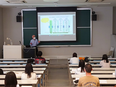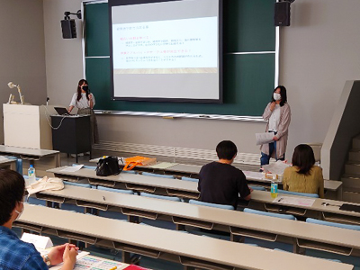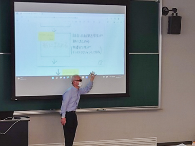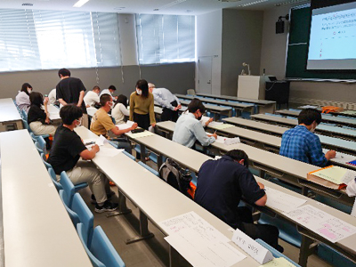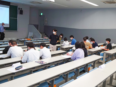 後半には、学科の特色の説明に続いて、田邊文彦教授による模擬授業(育成ゼミ)が行われました。ゼミ形式で行われ、参加した高校生は、田邊先生のゼミ生と一緒に仮想的なセブンイレブンの店舗の売上アップを図る計画を考えて、グループで話し合いながらレポートにまとめました。