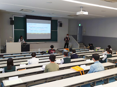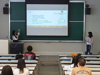 学科長の挨拶から始まり、入試説明が行われたあと、4年生・3年生の在学生によって学生生活の紹介が行われました。大学生活を楽しく、充実した物とするためのアドバイスを織り込みながら、授業や学友会・サークル活動などの課外活動の紹介など、自分達の経験を踏まえた話がされました。