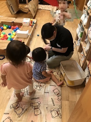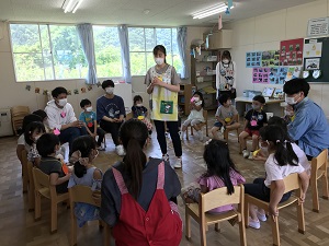 また本科目では、体験を通してもっと子どもの発達を学びたい有志に向けて、1,2歳児の保育場面への参加体験の機会を設けました。協力していただいた施設は、仙台市八木山にある学校法人仙台こひつじ学園認定向山こども園です。他の授業で作成したフェルトのおもちゃを寄付させていただいたご縁で実習を引き受けていただきました。言葉でのコミュニケーションがまだ難しい乳幼児と触れ合う機会を通して、意図を汲み取ることの大切さや寄り添う姿勢を学んだとの感想が聞かれました。