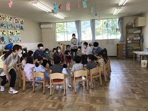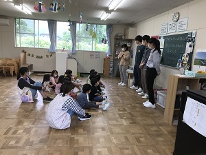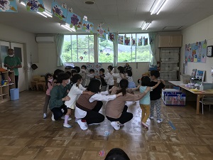 実習は、4歳児のクラスに入り、担任の先生方にご提案いただいた遊びの中から学生たちが選択し、そこに工夫を加えて行いました。フルーツバスケットやじゃんけん列車、猛獣狩りなど一度はやってみたことのある遊びばかりでしたが、相手は子ども達です。大人とは違います。楽しく遊ぶつもりが泣き出す子どもや遊びに加われない子どももいて、学生たちは大慌てで対応していました。まさしく体験を通して、“子ども”を学んでいました。学生達には1回きりでしたが、5人1組を毎回2組で計3回訪問させていただきました。レンゲ組スミレ組の先生方と子ども達には多くのことを学ばせていただきました。