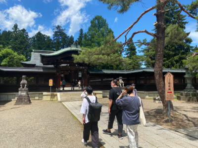 次に、上杉家廟所に行きました。ここは、上杉家歴代の藩主たちの廟がいくつも並んでいます。上杉家の家系図や廟に使われている建材も見ることができました。ここには杉の木が植えてありますが、その理由は、廟が壊れてしまったときにその杉の木を使ってすぐに直せるようにするため、と渡邊先生に教えていただきました。この日は、この場所に団体の観光客の人たちが来ていて、観光スポットとして人気があるということが確認できました。
