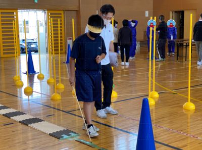 白杖体験では、タオルで視覚をブラインドし、1歩出すことの怖さを体験してもらいました。