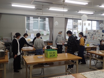 周到な準備をしていた結果,当日「クイズ」,「習字」,「絵葉書」,「エコクラフト」,「ボーリング・ボール投げ」などのコーナーが好評に実施しました.1年生も宣伝や接客,コーナーの運営など2年生と一緒に参加者におもてなしをしました.