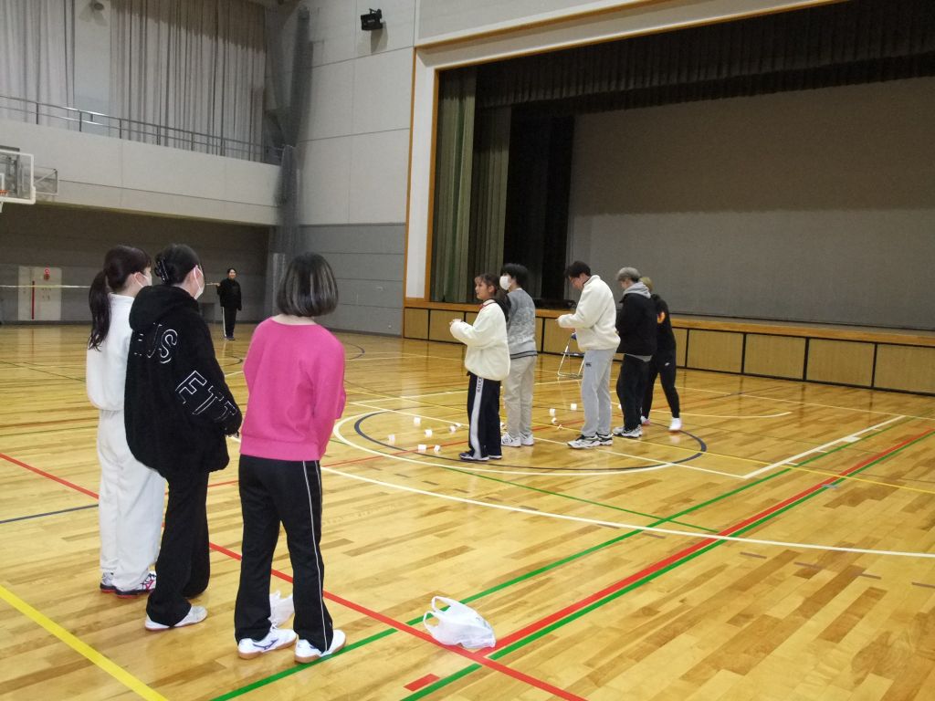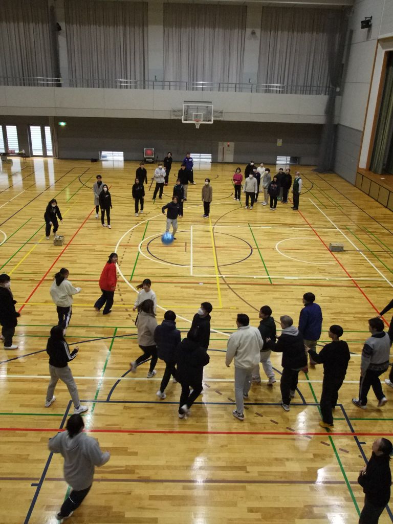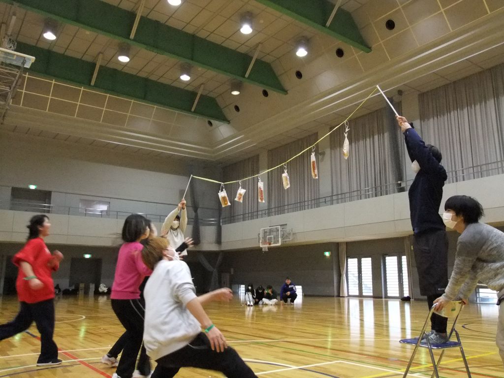 2023年12月15日(金)の午前に本学の体育館にて、1年生と3年生との合同交流会を実施しました。交流会では、パン食い競争と借り物競争、ドッジボールを3年生有志と1年生、ゼミ教員らとともに行いました。