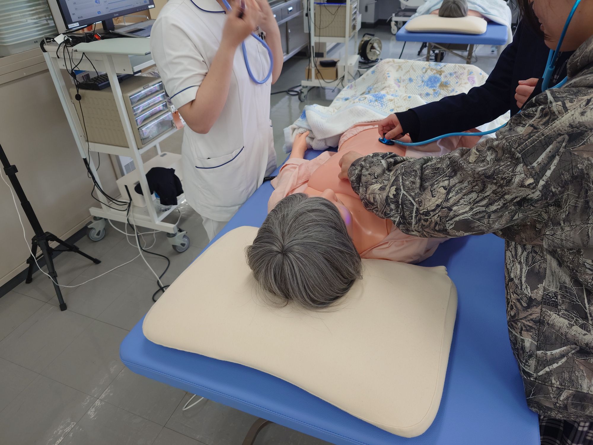 毎回好評のシミュレーター体験では、新生児から成人までの呼吸音や心音の聴取をしながら、