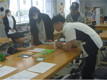 ★OTに関するクイズコーナー:問題は、授業で得た知識をもとに、1年生が考えました。小さいお子さんにはたくさんヒントをあげて、優しく対応。さすがの気配りです。