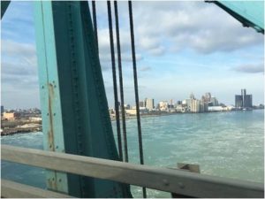 デトロイトへは学会発表を一緒に行った研究者仲間のご夫妻とレンターカーを借りて行ってきました。陸路でカナダからアメリカに入国する際には、アンバサダー橋というとても大きな吊橋を通ります。1929年(世界大恐慌の年!)に完成したこの橋の長さは全長が2,286mもあり、完成した当時は世界最長だったとのことで、橋の上から見る景色は一見の価値ありです。この橋を無事に渡りきると、デトロイト川にアメリカ側の入国審査施設があります。そこには機関銃を持った男性が数人いて、私たちを見るなり、荷物を全て持って車を降りて建物の中に入るようにと促しました。建物の中では予想外に念入りな審査を受け、40分〜50分もかかってから解放されて車に戻ることができました。