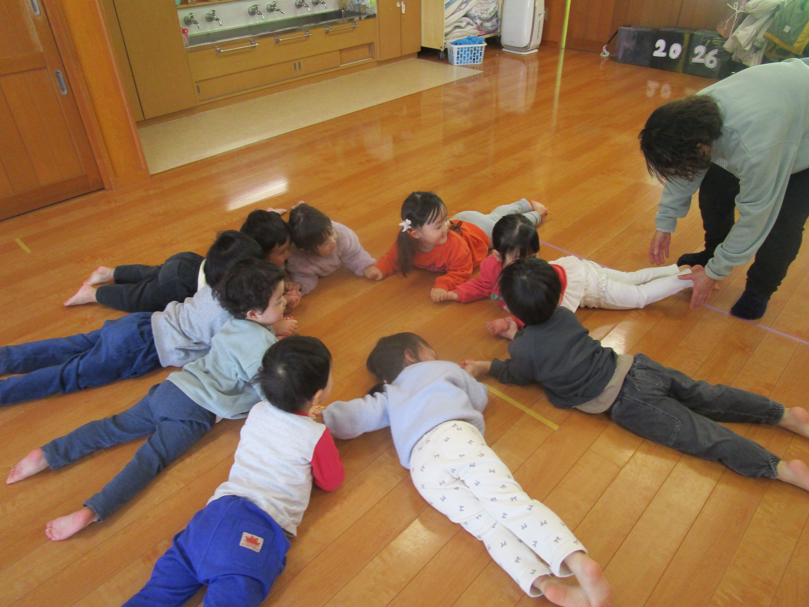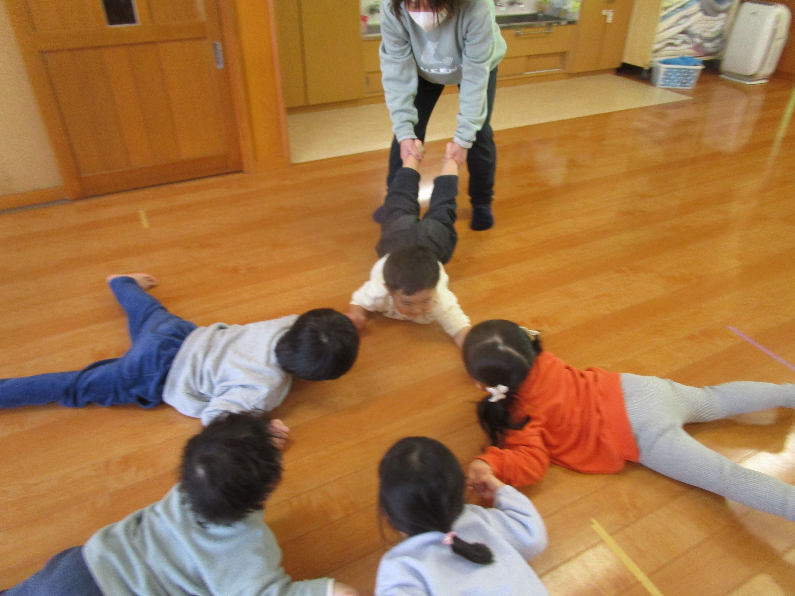 この日は、戸外遊びに行く前にみんなで室内で運動遊びをしました!