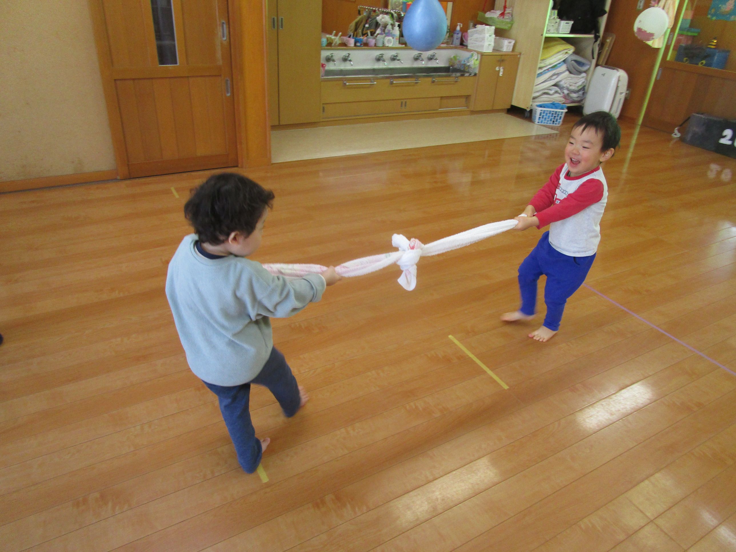 最初に、タオルを使って綱引きをしました😊