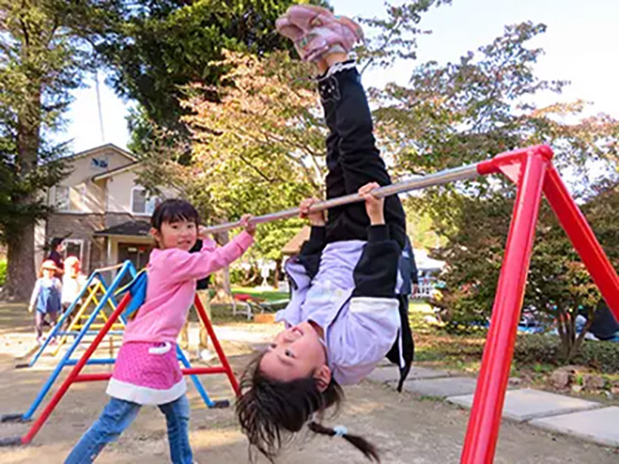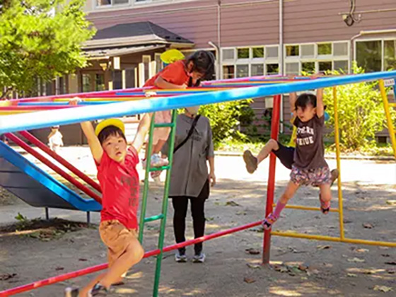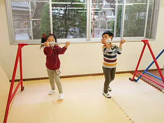 ジャングラミング・雲梯などの安田式遊具や室内でのトランポリン・マット・平均台遊びを通して、「体のバランスをとる動き」「体を移動する動き」など、多様な動きを経験します。将来的にスポーツに結びつく動きや、とっさの時に身を守る動きを身につけられるよう積極的に運動遊びを行っています。
