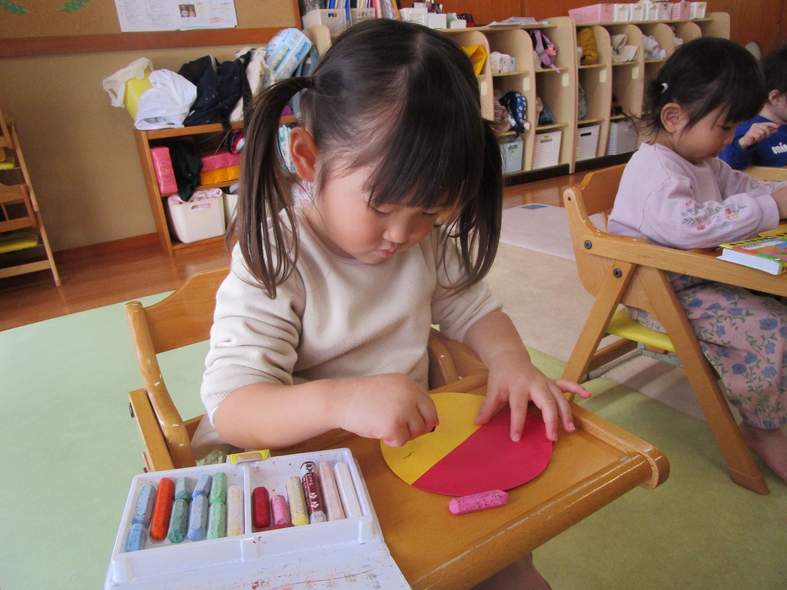 鬼のパンツにクレヨンで好きな色を選んで模様を描いています🖍