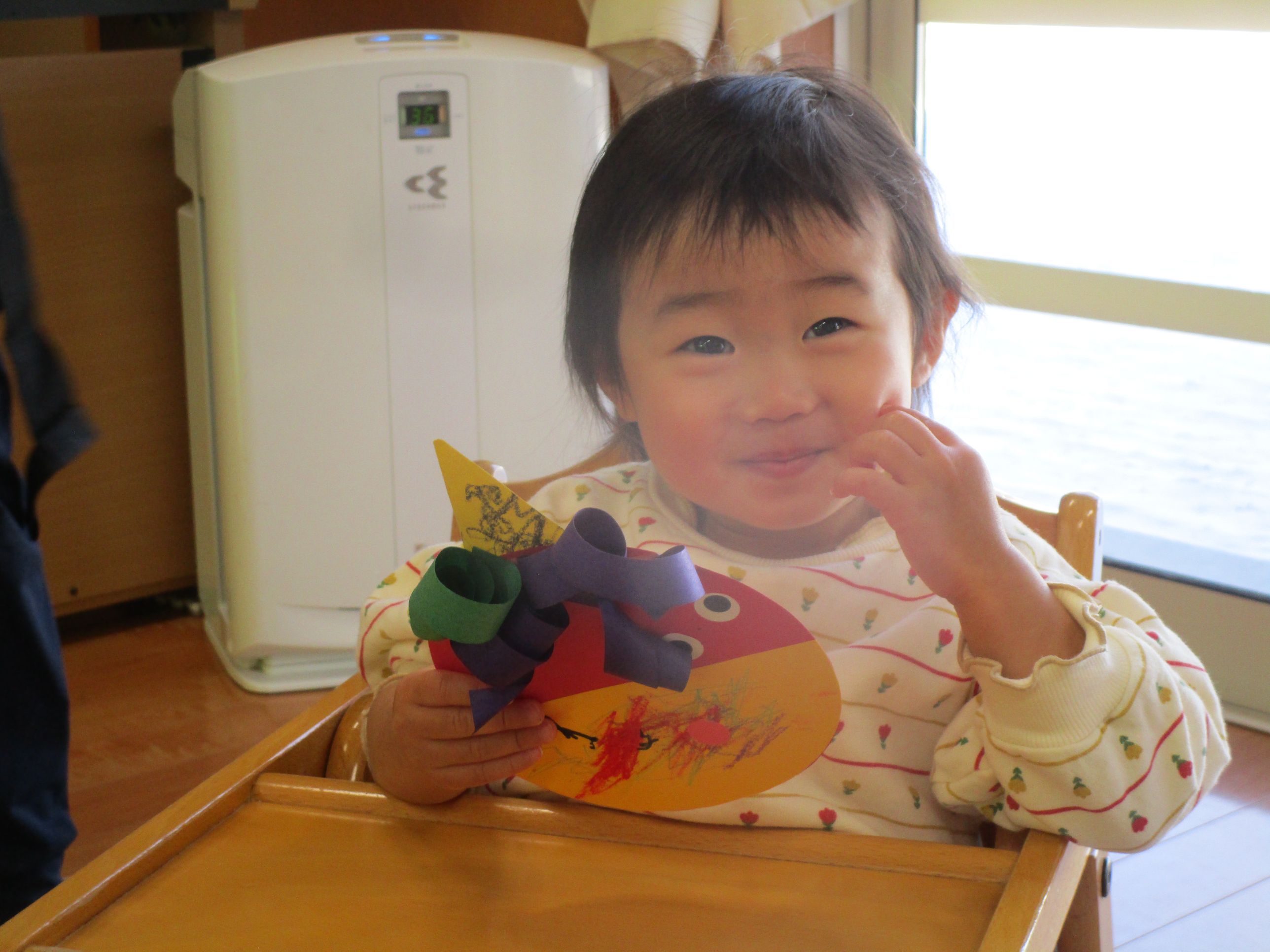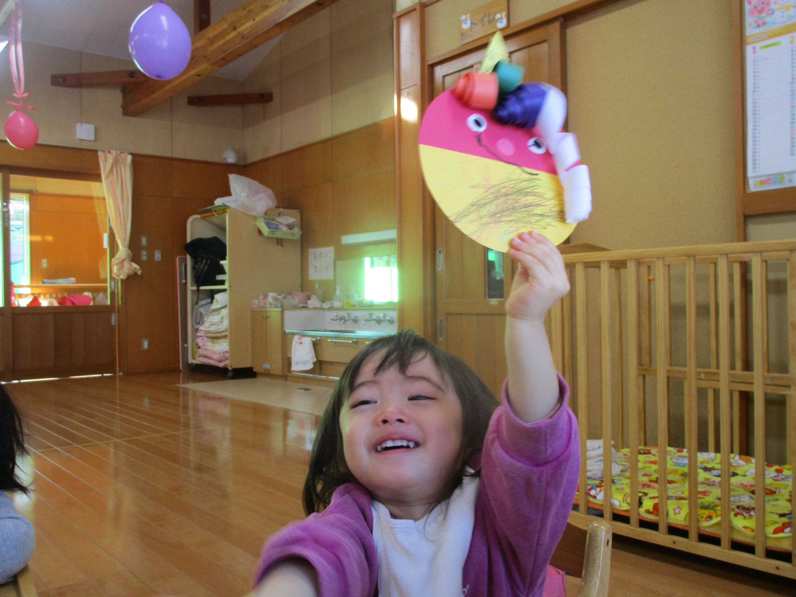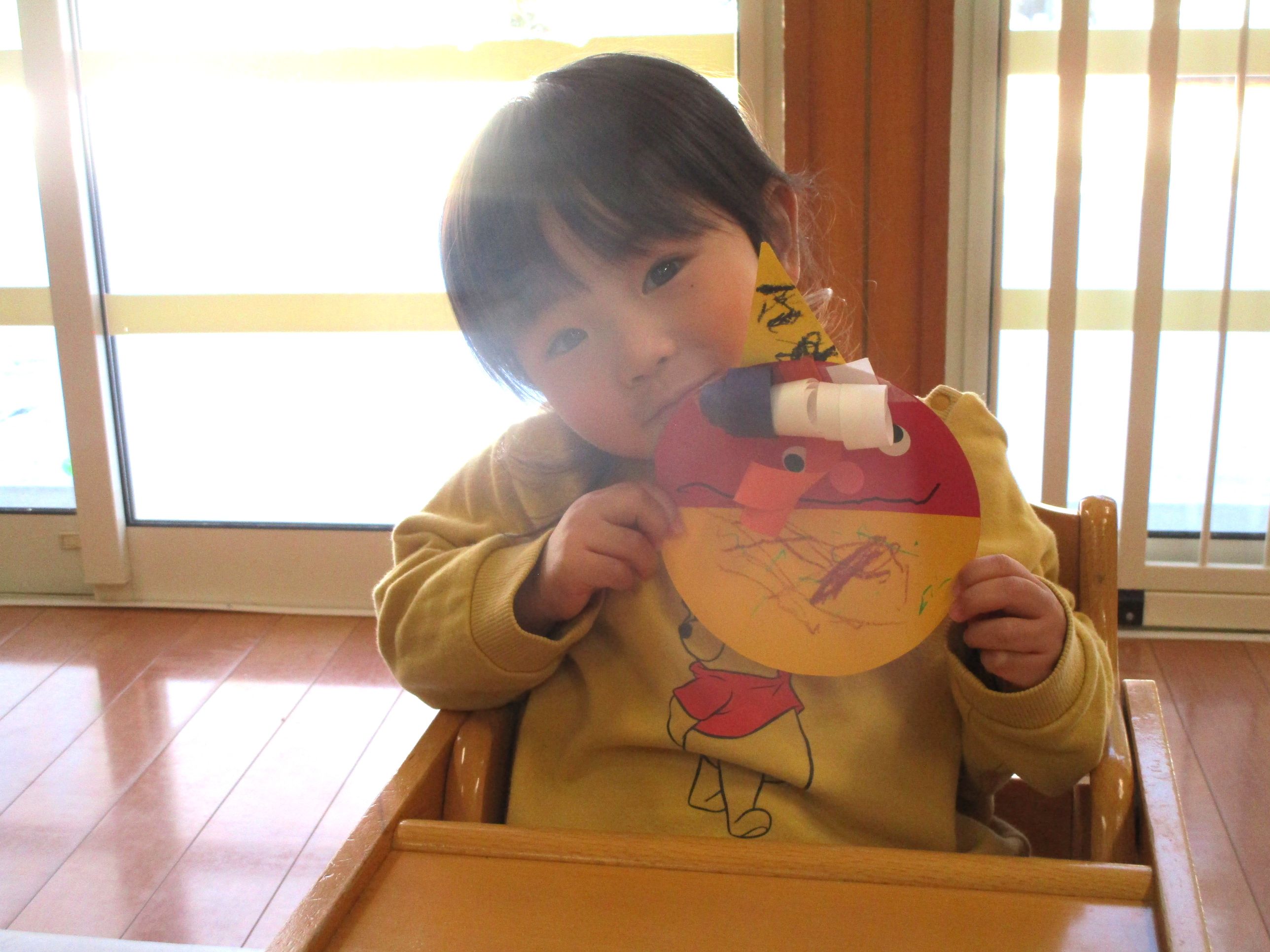 出来上がった鬼のお面を持って満足げな子ども達です😄