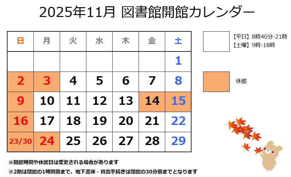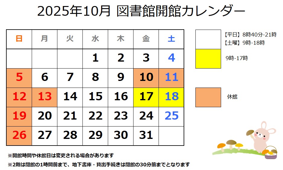 | お知らせ | 蔵書点検に伴う休館のお知らせ(9/8~9/11) | |