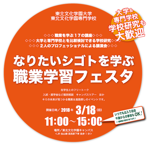 3月18日に、職業学習と学校研究ができる「なりたいシゴトを学ぶ〜職業学習フェスタ」を開催します。