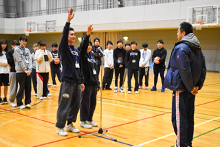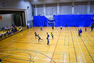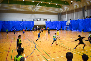 試合の様子(体育館の壁をブルーシートで保護しています)