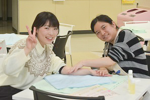 2月28日(木)、学生食堂で「癒しのアロマサークル」の有志によるハンドマッサージのサービスがありました。