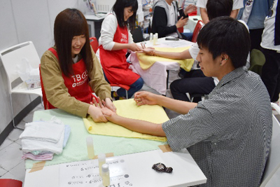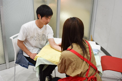 7月8日(月)昼休み、学生食堂の一部スペースを借りて、ハンドマッサージを行いました。
