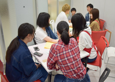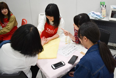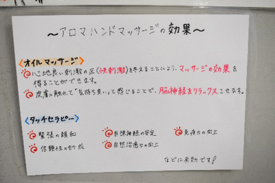 ひとりおよそ10分間、好きな香りを選んでもらって、会話をしながらハンドマッサージを行います。予告なしでの実施でしたが、興味をもってくれた方が来てくださり盛況!男子学生もたくさん来てくれました!