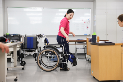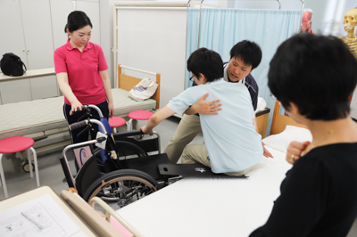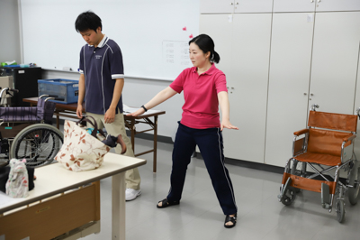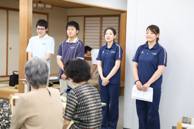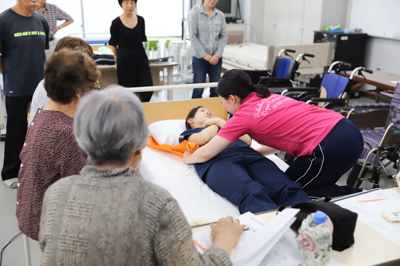 保健福祉学科生活福祉専攻の在学生も協力し、介護技術の講義と実際の体験授業を行いました。